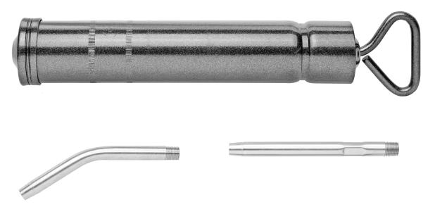 Inyectores para aceite (valvolina) con depósito metálico y émbolo de doble acción. Para vaciado por aspiración, llenado o puesta a nivel de lubricante en diferenciales, transmisiones, cajas de cambio y filtros. Depósito de 500 cc con salida rígida recta-curva.