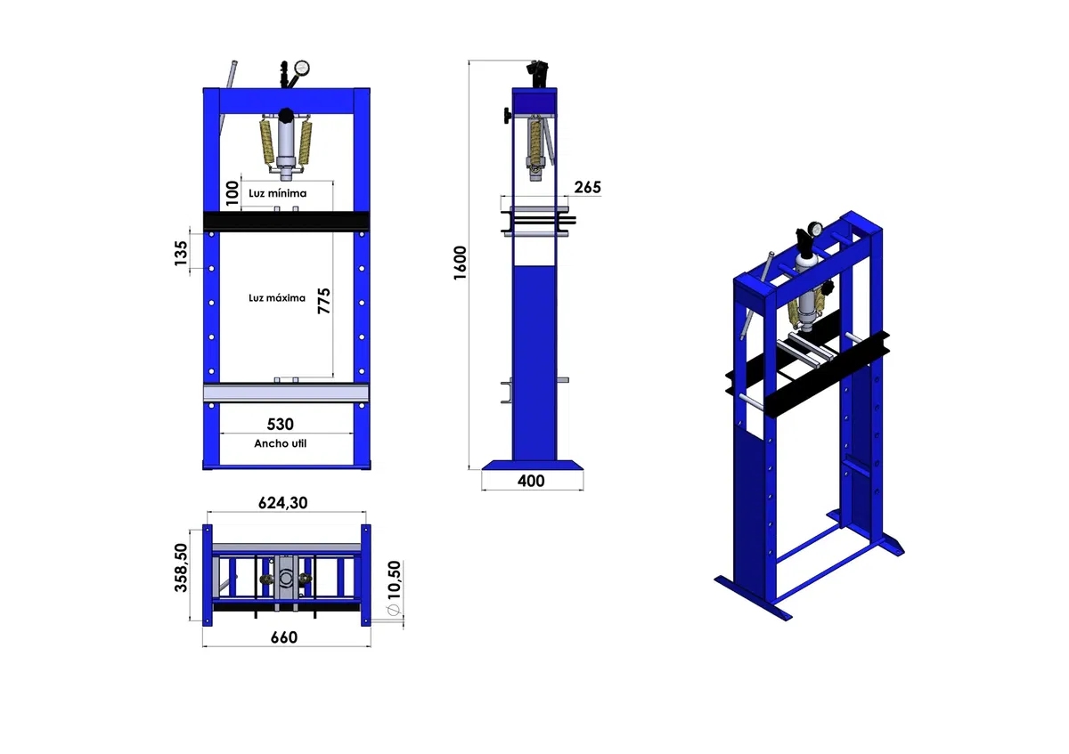 Esta prensa hidráulica de 15 toneladas con estructura de pie y 4 columnas ha sido diseñada para brindar máxima robustez y precisión en tareas de prensado profesional. Su estructura reforzada garantiza una distribución uniforme de la fuerza, ideal para uso intensivo en talleres mecánicos, metalúrgicos e industriales.