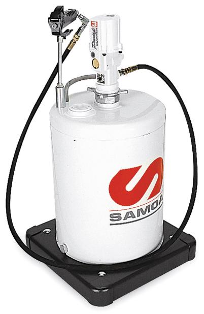 Equipo de engrase carenado para bidones 12-20 kg. Equipo móvil con bomba neumática de alto rendimiento PM3 55:1 y carenado de protección del bidón que facilita su utilización con bidones originales de grasa desde 12 hasta 20 kg. Para engrase forzado punto a punto a alta presión