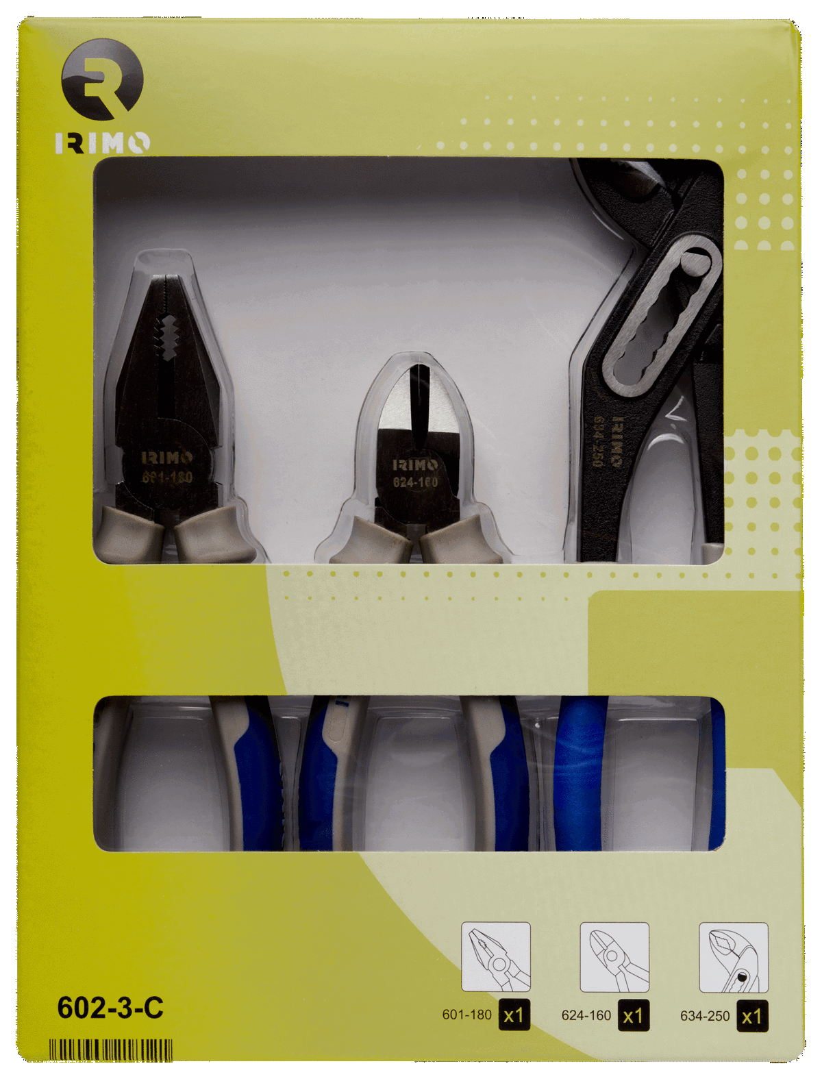 - El juego incluye alicate de corte diagonal (160 mm), alicate universal (180 mm) y pinza articulada (250 mm).