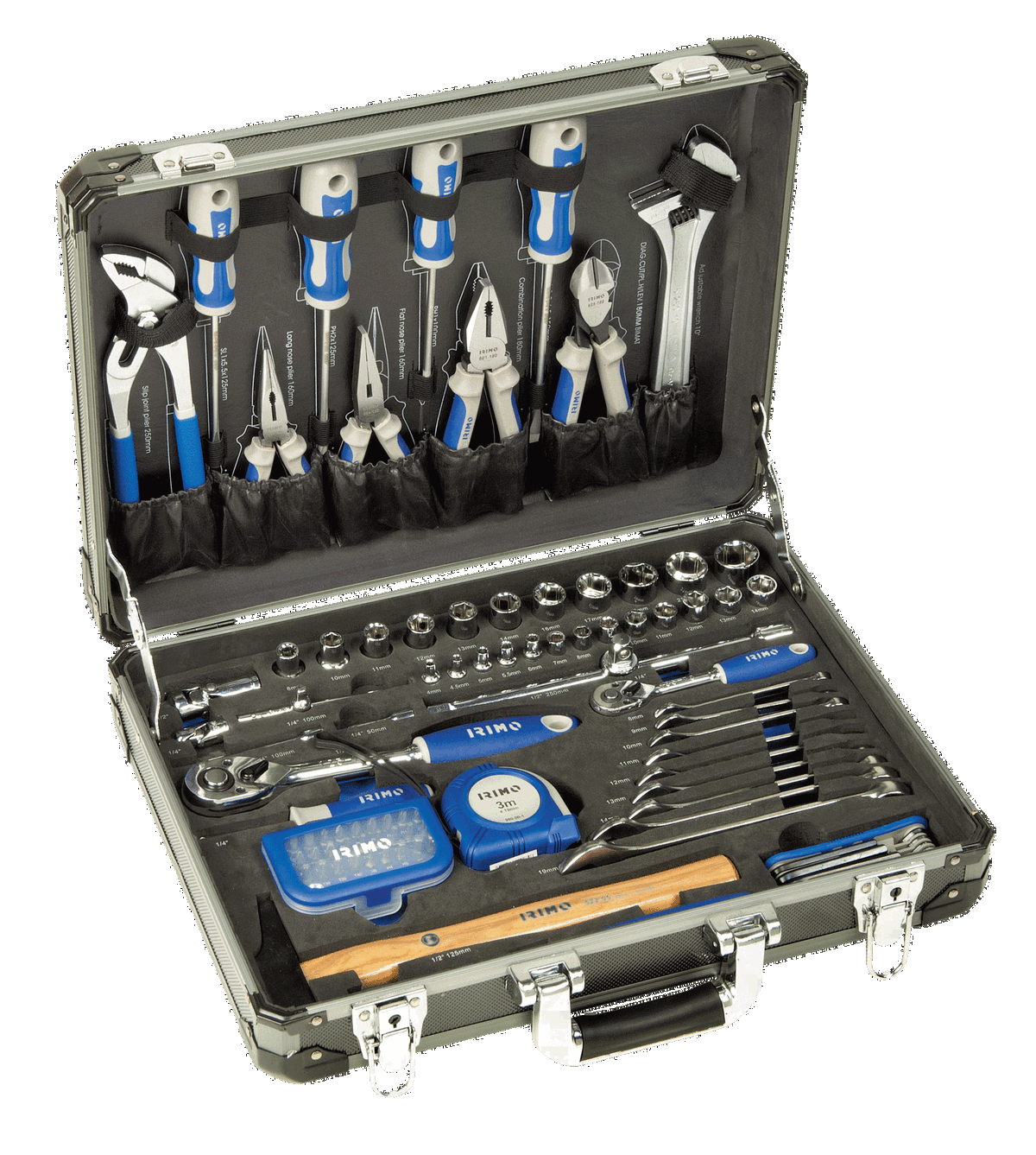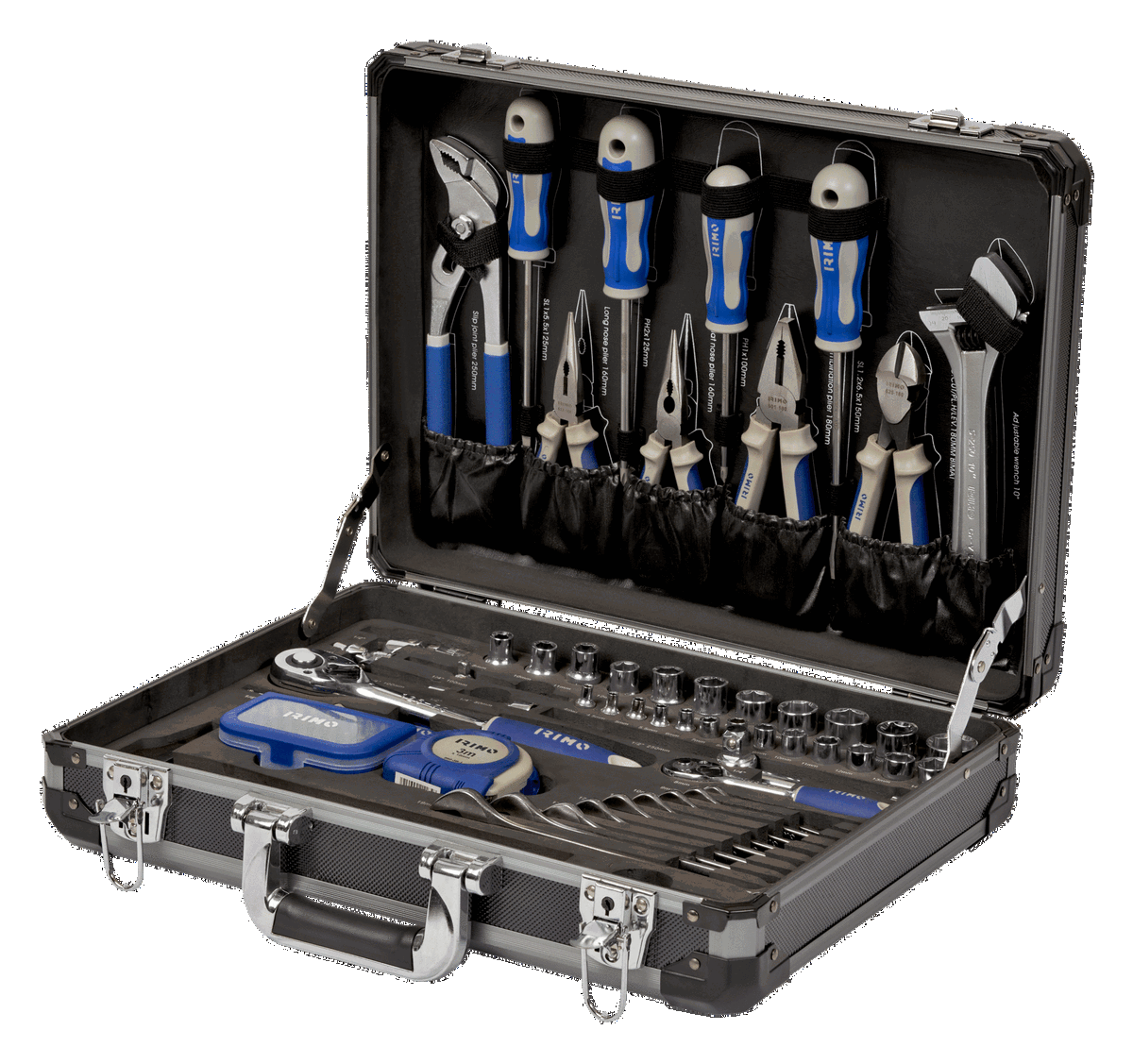 - Componentes: bocallaves hexagonales de 1/4" y 1/2"; 4 a 14 mm y de 8 a 22 mm, llaves combinadas: de 8 a 19; destornilladores (×4): ranurados y Phillips; martillo de ebanista, cúter con sistema de seguridad; alicates (×5): de boca plana, de boca semirredonda, de corte diagonal y combinados; pinza articulada; cinta métrica; juego de llaves hexagonales; juego de puntas; portapuntas de 1/4", crique reversible y accesorios.