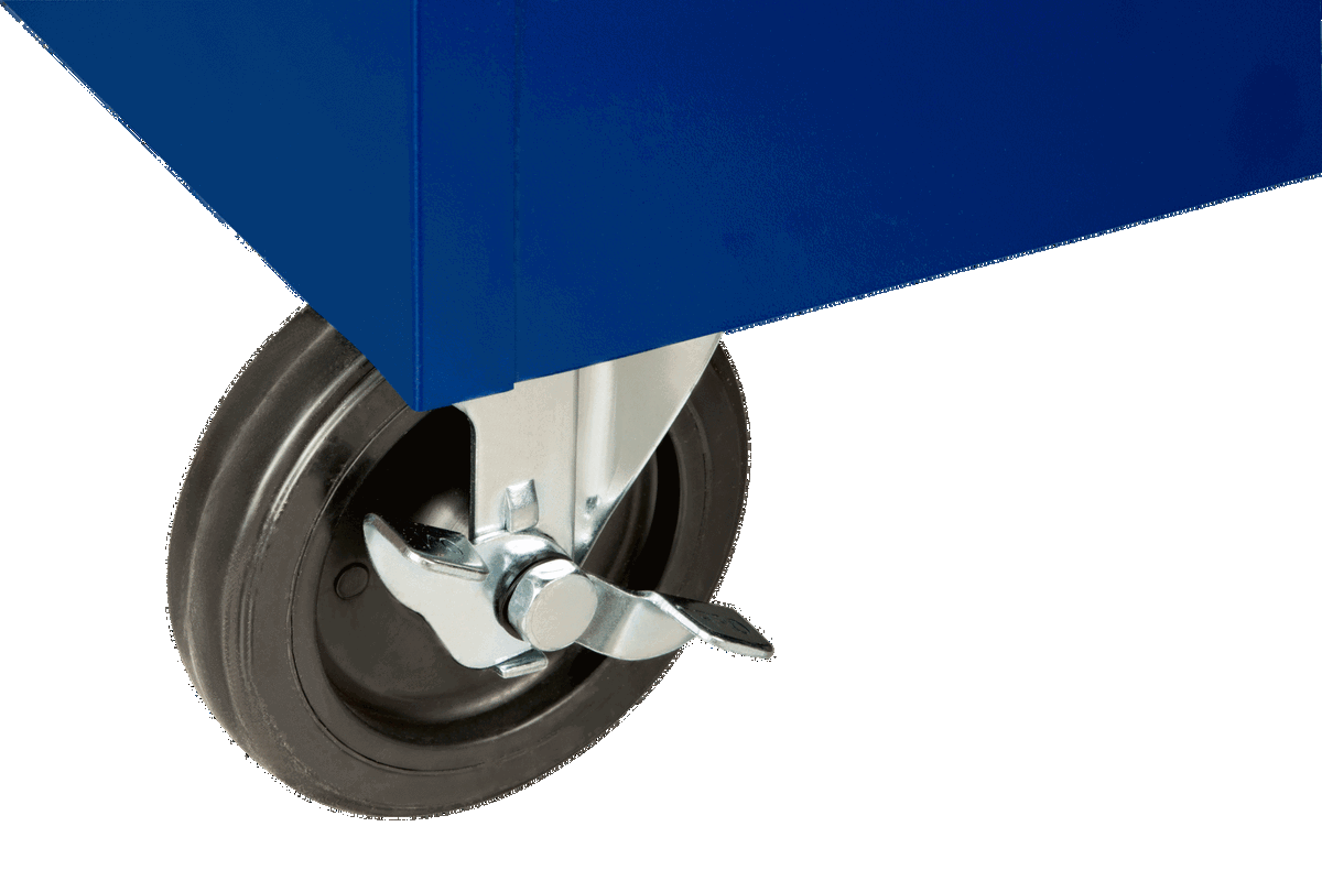 - Ruedas de 125 × 30 mm con rodamientos de bolas y goma que no deja marcas en las superficies: 2 ruedas fijas y 2 ruedas giratorias.
