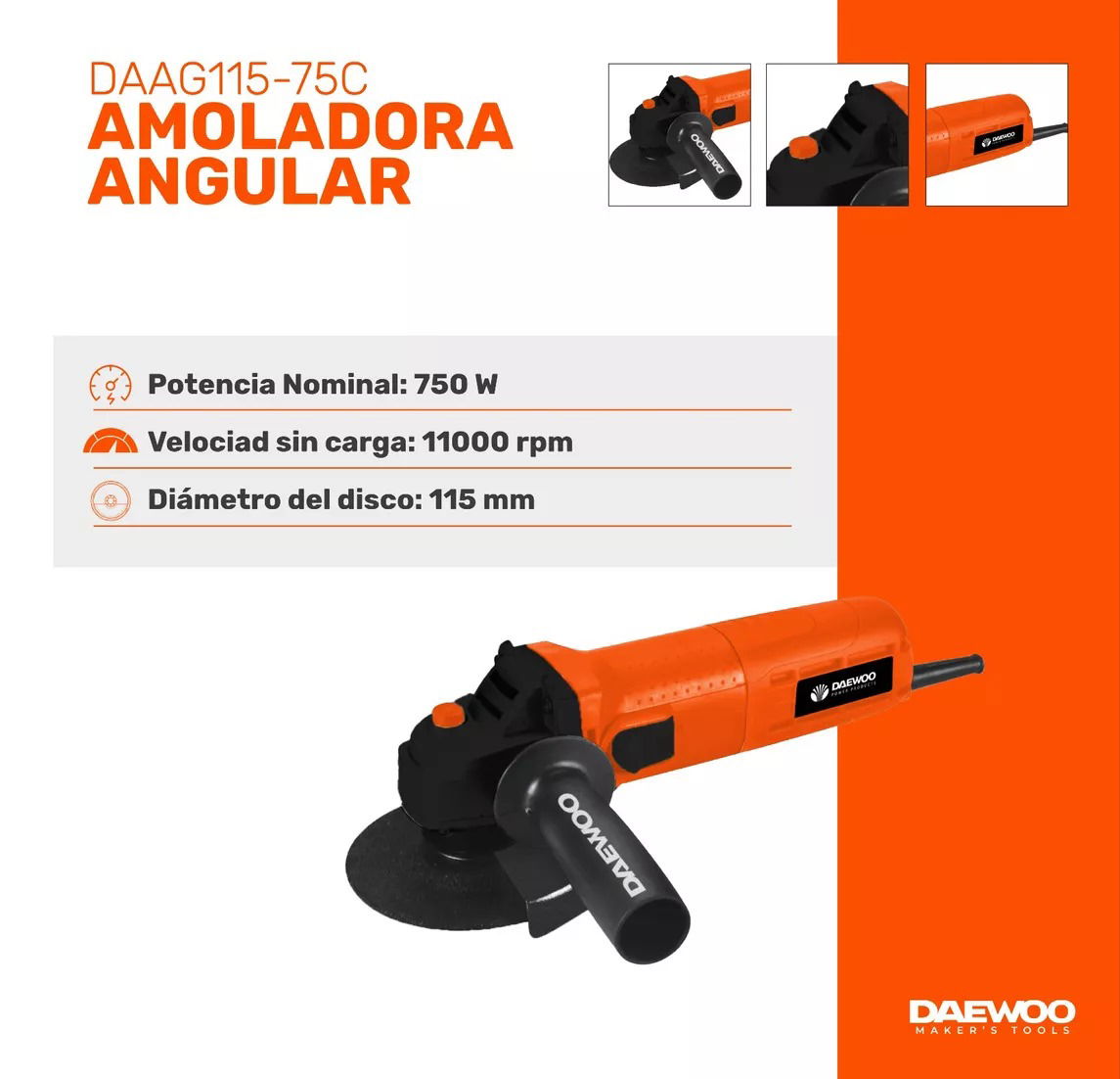 La Amoladora Angular Daewoo DAAG115-75C es una herramienta potente y versátil, diseñada para cortes y desbastes precisos en metal, piedra y otros materiales. Su diseño compacto y ergonómico permite un manejo cómodo y seguro en trabajos exigentes.