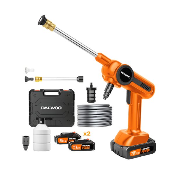 La batería de alta capacidad de 2mAh proporciona una autonomía de hasta 30 minutos. Incluye un kit de lavado a presión completo con dispensador de jabón, boquillas de 0° y 40° para diferentes patrones de rociado, ajustables girando la cabeza del dispositivo.