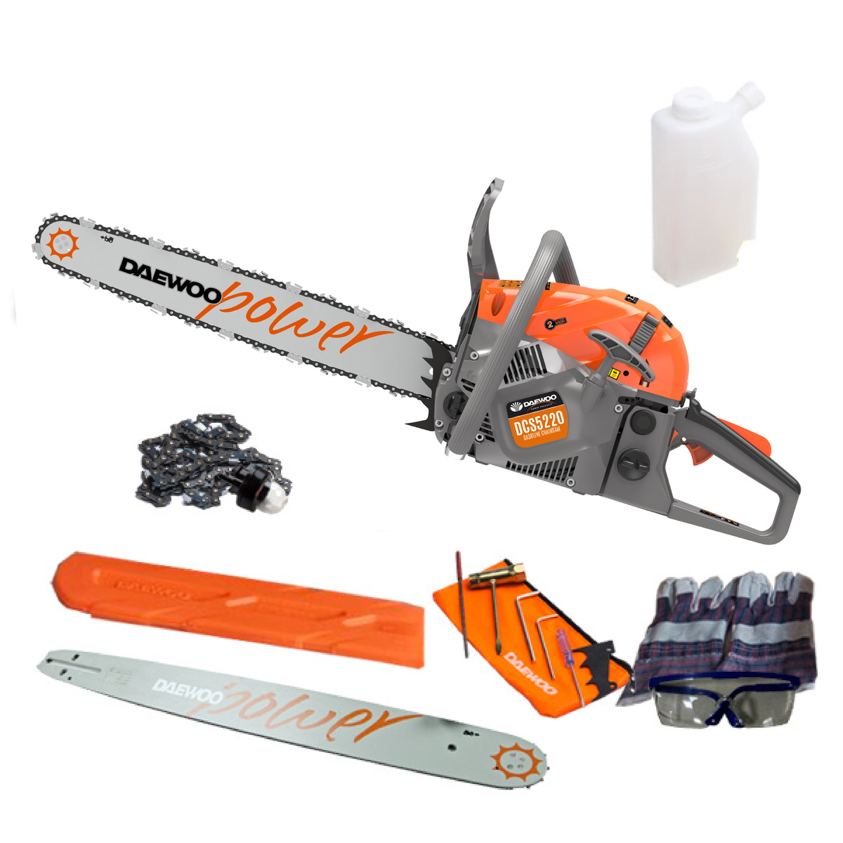 - Incluye: Espada, protector de espada, botella de mezcla de combustible, cadena, guantes, gafas, cebador y kit de herramientas.