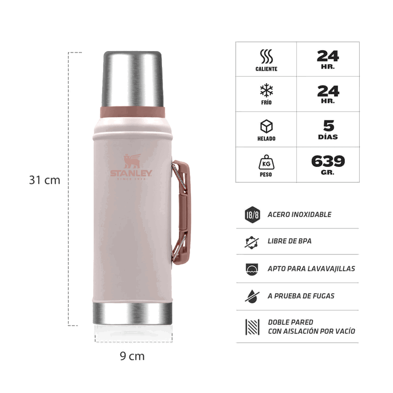Llevá este clásico con vos y disfrutá de momentos compartidos. Esta botella mantiene tus bebidas calientes y frias hasta por 24 horas gracias a la doble pared con aislamiento al vacío. Su construcción robusta significa que es lo suficientemente resistente para soportar cualquier aventura, todo mientras mantiene tus bebidas calientes y frías durante un día completo. Su tamaño compacto hace que sea fácil de sostener con una mano, incluso cuenta con un tapón giratorio para un vertido más suave. Ademas, su tapa aislada funciona también como taza para beber. ¡Llevá el Termo Mate Stanley a cualquier lugar con la certeza de que tu bebida siempre estará caliente o fria y sin fugas!