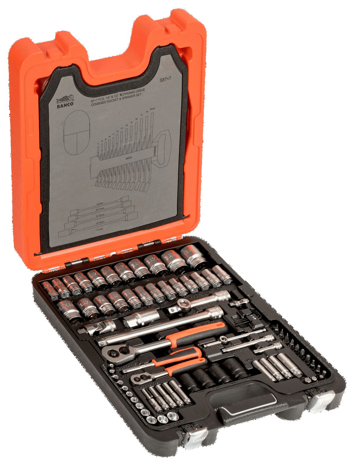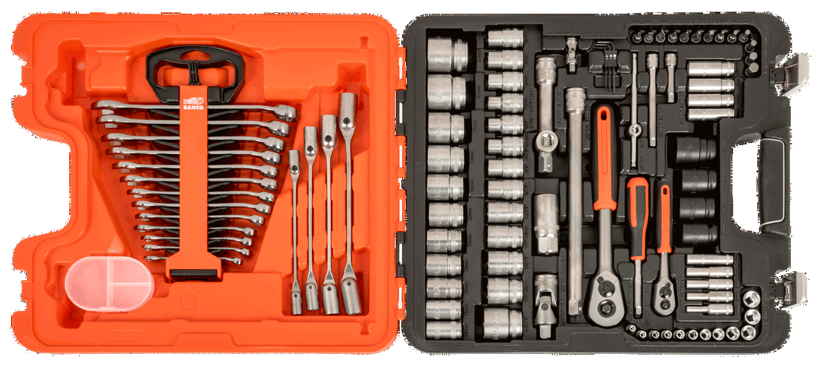 - 13 llaves combinadas: 7, 8, 9, 10, 11, 12, 13, 14, 15, 16, 17, 18 y 19 mm, en un práctico estante para herramientas extraíble.