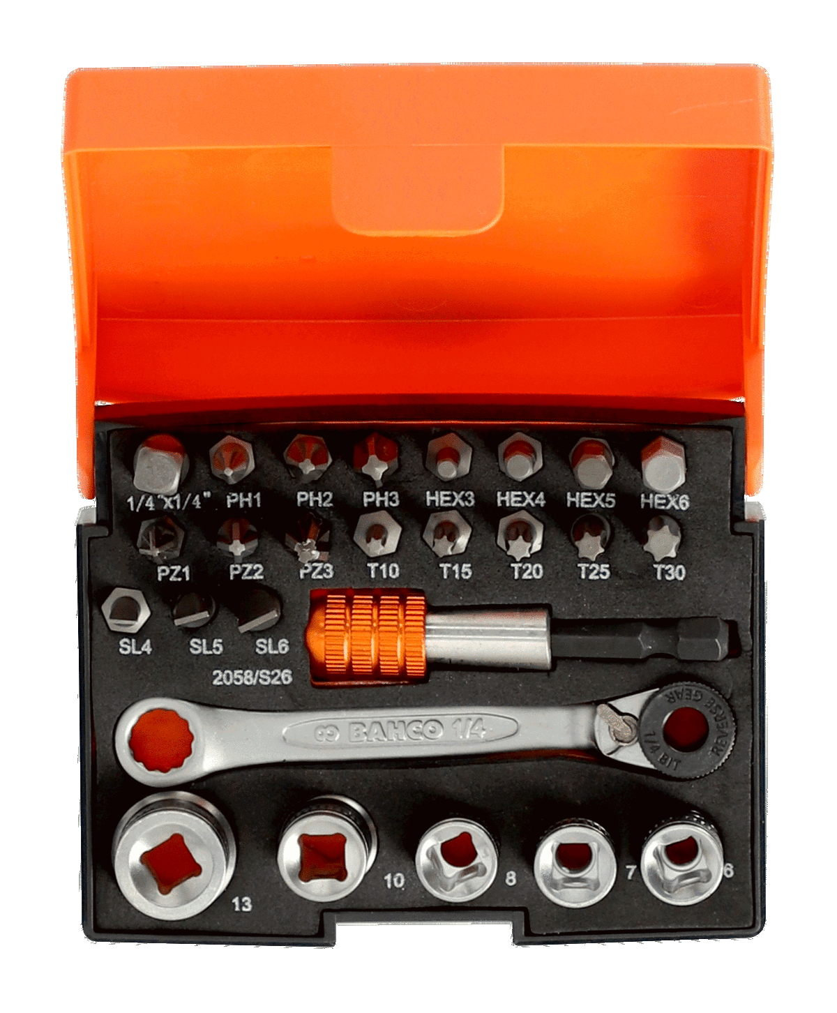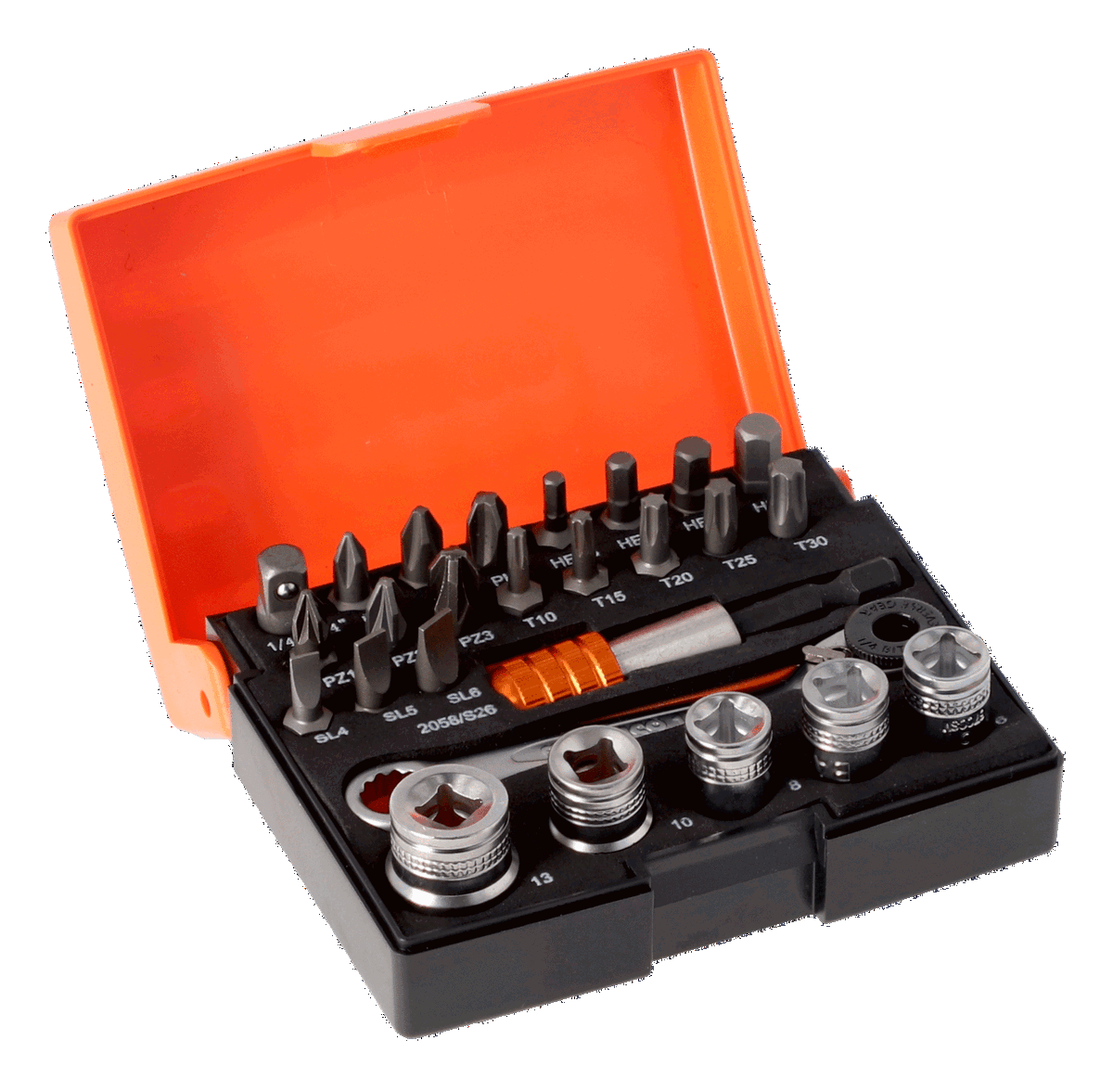 - Incluye 26 piezas: 18 puntas + 5 vasos + 1 portapuntas con carraca + 1 adaptador + 1 portapuntas