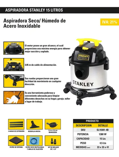 ASPIRADORA DE POLVO Y AGUA STANLEY DE 15L 220v-